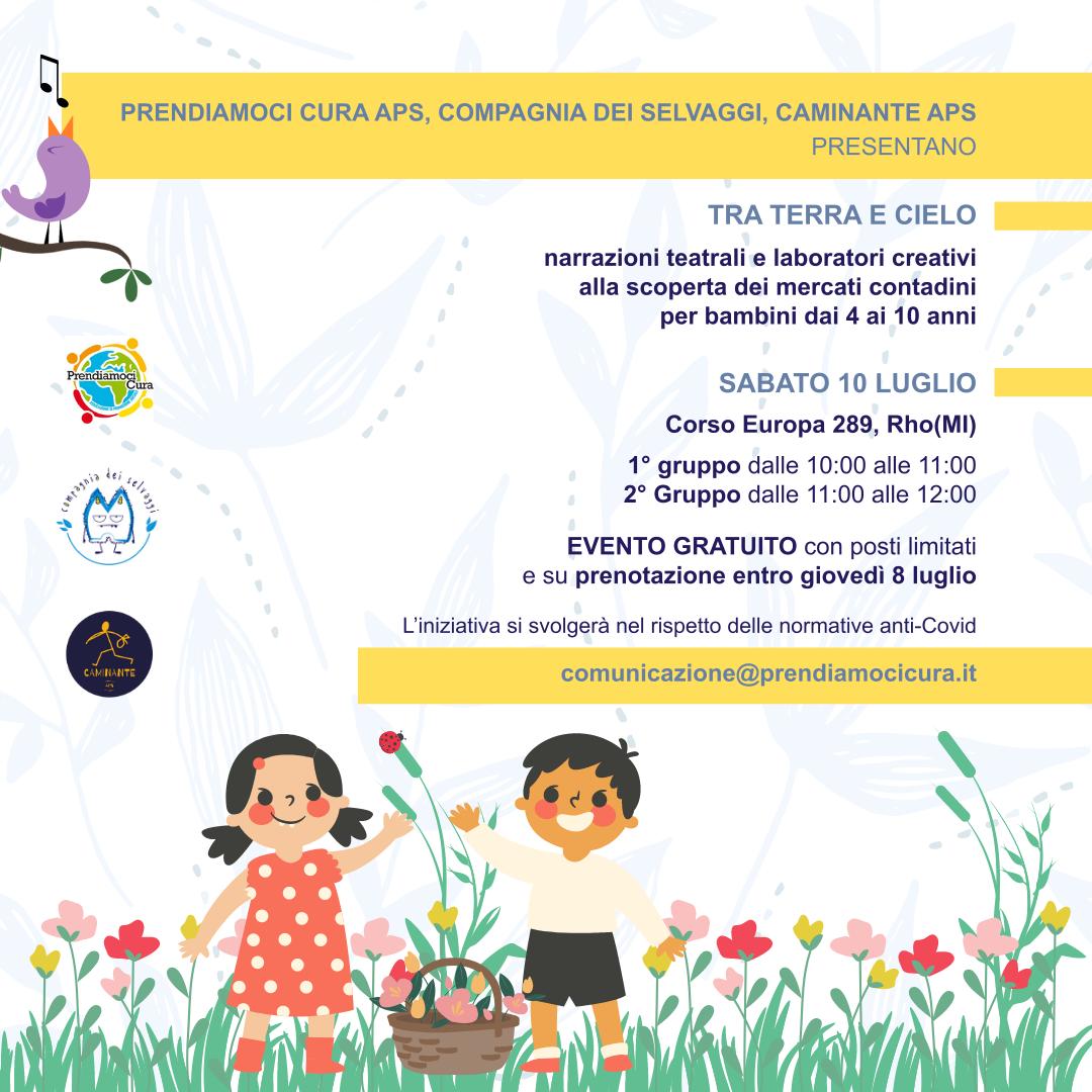 Le modalità sono le medesime: il laboratorio creativo “Tra terra e cielo” è dedicato ai bambini tra 4 e 10 anni, verrà gestito dai bravissimi “I Selvaggi” supportati dai performer di Caminante APS, Ingresso libero con prenotazione obbligatoria entro giovedì 8 luglio scrivendo mail all’indirizzo comunicazione@prendiamocicura.it