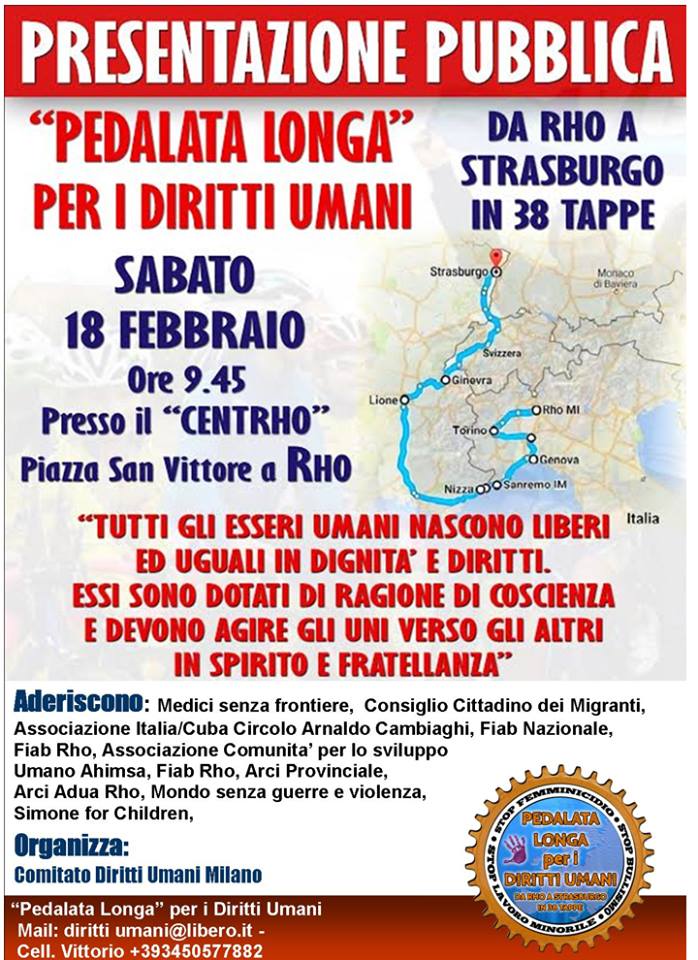 SABATO 18 febbraio presso il “CentRho” in Piazza san Vittore avverrà la presentazione pubblica del progetto e verrà illustrata la pedalata; tale percorso sarà suddiviso in 38 Tappe che andranno a toccare varie città tra cui :