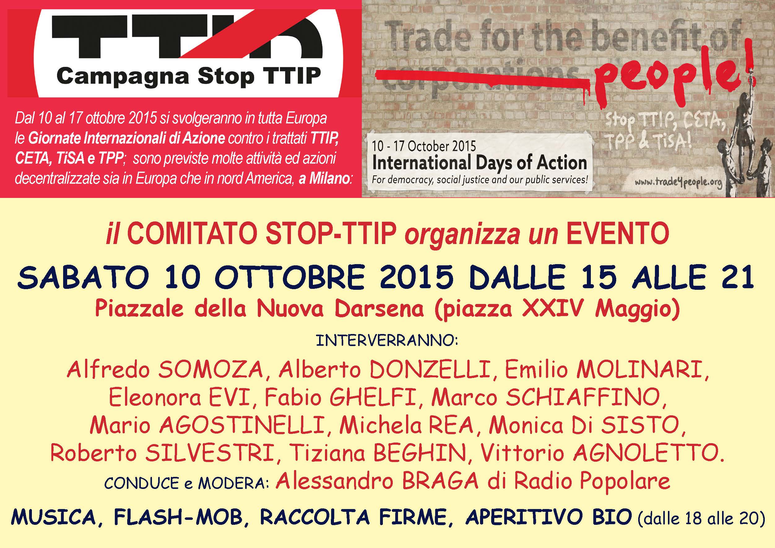 Si entra nel vivo della campagna di sensibilizzazione Stop-TTIP. Dal 10 al 17 ottobre sono stati organizzati al livello europeo una serie di eventi volti a coinvolgere la popolazione intorno a questo tema. A Milano, in una zona centrale come la Darsena, sono stati coinvolti diversi relatori, disponibili per chiarimenti ed illustrare il punto della situazione rispetto alla trattative in corso